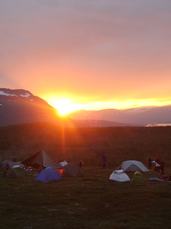 Less strenuous but equally beautiful hikes are available for those who do not climb the Kebnekaise. We time our ascents so we reach our chosen summits at the end of the afternoon, when the endless views are bathed in the magnificent orange light of the never-setting sun. We all meet up again at our bivouac site, on the shores of an exquisite lake, tired but happy!