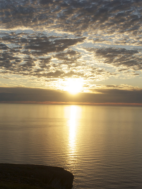 The distant sea glistens smoothly in the bright sunlight. It is cool for a while, then warm again. Birds flitter around us as we walk, then fly off into the distance. We wonder where they can build their nests. Fifty antlered heads watch us from afar. We gradually creep closer, being careful not to startle them, as they are warier than the reindeer on the mainland.